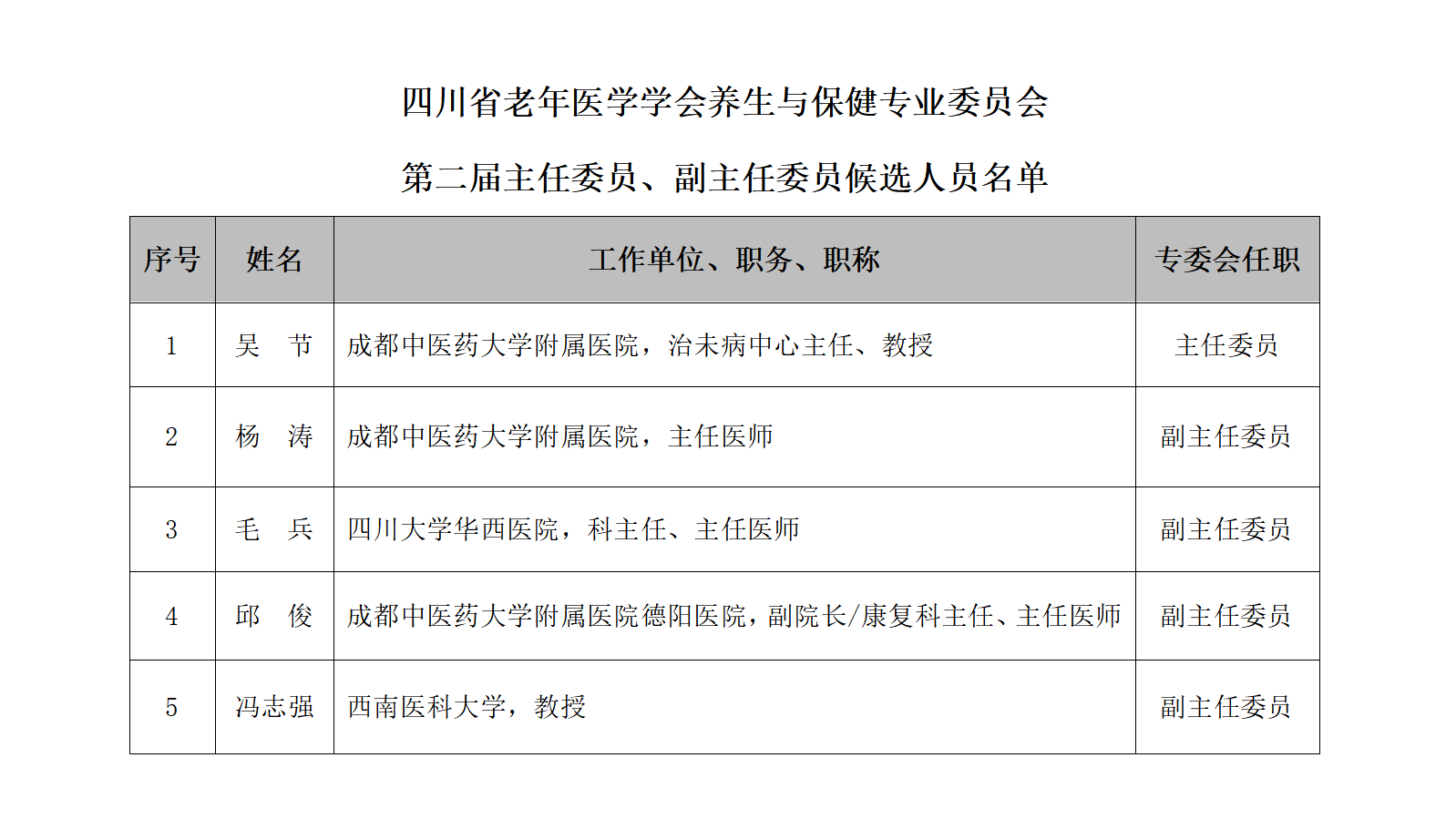 四川省老年医学学会养生与保健专业委员会(以下简称“专委会”)拟定于2025年10月31日召开第二届委员会选举会议。本着公平、公正、公开的原则,现将专委会第二届委员会主任委员、副主任委员候选人员予以公示。公示期为五个工作日。如在公示期间内对候选人有异议,请直接向学会秘书处反馈。 公示时间:2025年10月27日至10月31日 联系电话:028-8627 8655 186 8138 6600 附件:主任委员、副主任委员候选人员名单 四川省老年医学学会 |