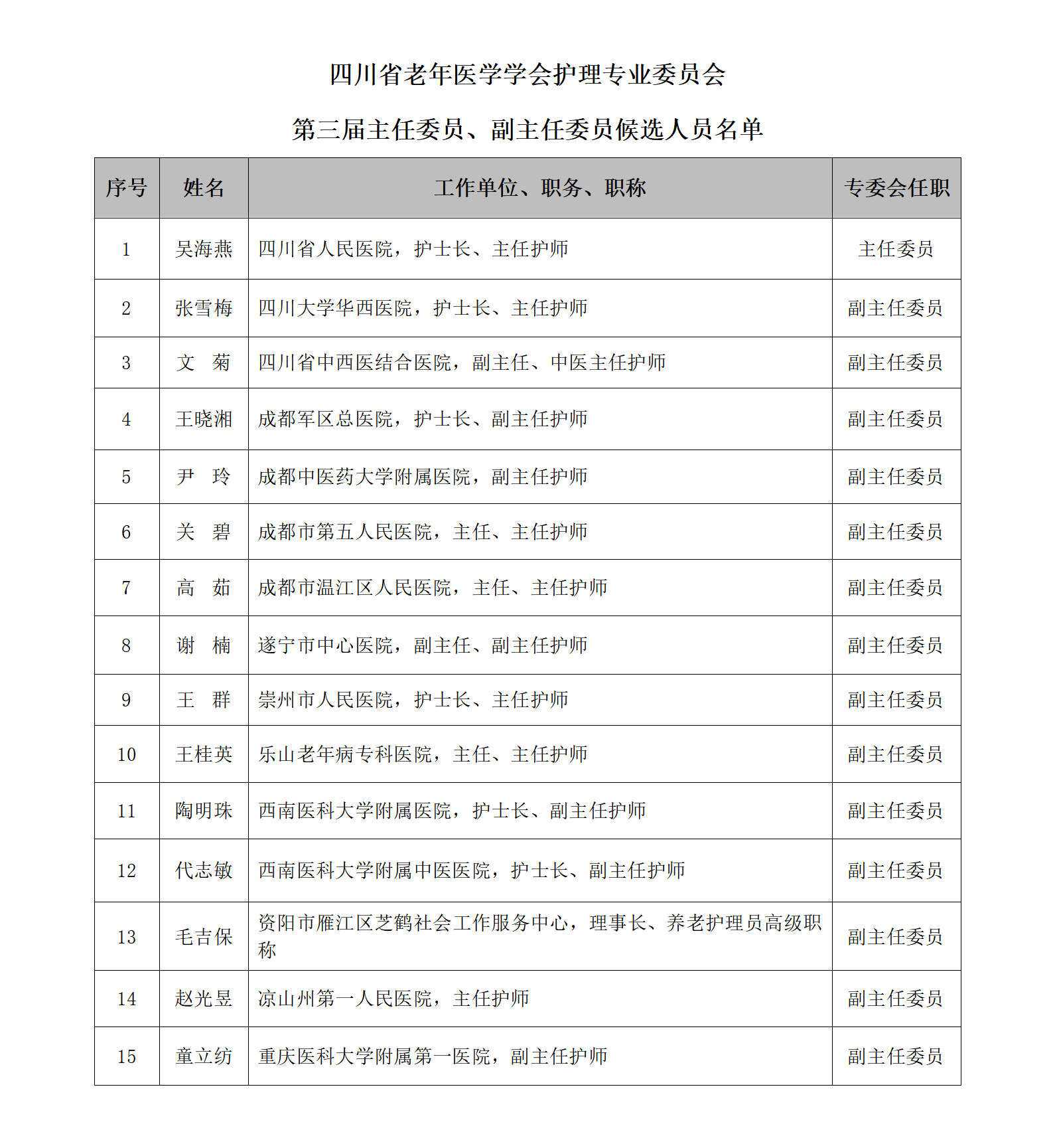 四川省老年医学学会护理专业委员会(以下简称“专委会”)拟定于2025年11月7日召开第三届委员会选举会议。本着公平、公正、公开的原则,现将专委会第三届委员会主任委员、副主任委员候选人员予以公示。公示期为五个工作日。如在公示期间内对候选人有异议,请直接向学会秘书处反馈。 公示时间:2025年10月27日至10月31日 联系电话:028-8627 8655 186 8138 6600 附件:主任委员、副主任委员候选人员名单 四川省老年医学学会 	 	 	  |