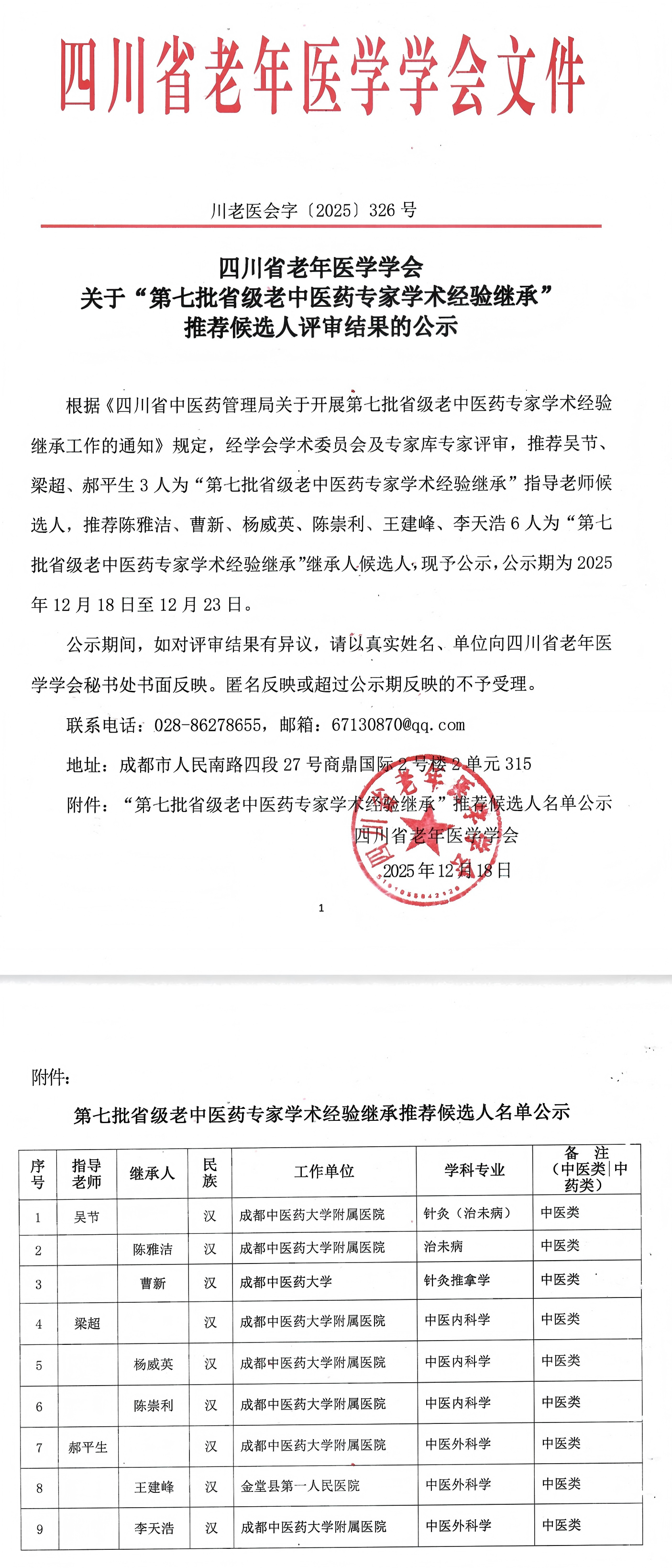 根据《四川省中医药管理局关于开展第七批省级老中医药专家学术经验继承工作的通知》规定,经学会学术委员会及专家库专家评审,推荐吴节、梁超、郝平生3人为“第七批省级老中医药专家学术经验继承”指导老师候选人;推荐陈雅洁、曹新、杨威英、陈崇利、王建峰、李天浩6人为“第七批省级老中医药专家学术经验继承”继承人候选人,现予公示,公示期为2025年12月18日至12月23日。 公示期间,如对评审结果有异议,请以真实姓名、单位向四川省老年医学学会秘书处书面反映。匿名反映或超过公示期反映的不予受理。 联系电话:028-8627 8655 邮箱:67130870@qq.com 2025年12月18日