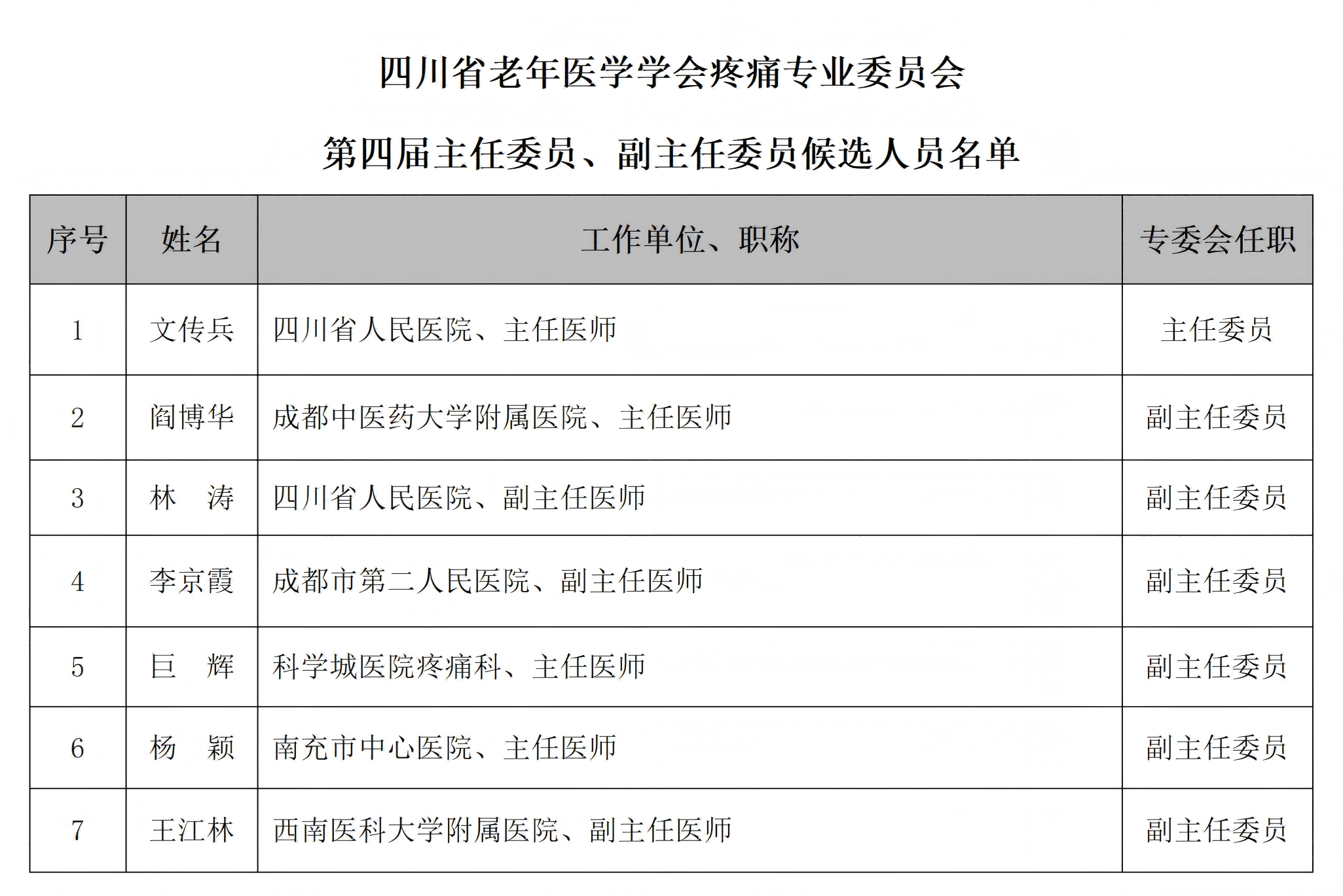 四川省老年医学学会疼痛专业委员会(以下简称“专委会”)拟定于2026年4月10日召开第四届委员会选举会议。本着公平、公正、公开的原则,现将专委会第四届委员会主任委员、副主任委员候选人员予以公示。公示期为五个工作日。如在公示期间内对候选人有异议,请直接向学会秘书处反馈。 公示时间:2026年3月23日至3月27日 联系电话:028-8627 8655 186 8138 6600 附件:主任委员、副主任委员候选人员名单 四川省老年医学学会 2026年3月23日
